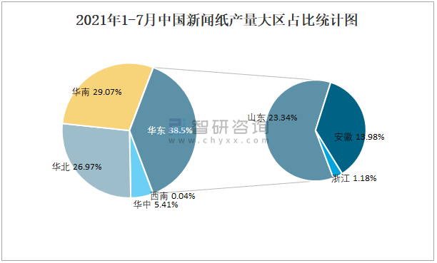 2021年1-7月中國新聞紙產量為56.7萬噸 華東地區產量最高(占比38.5%)
