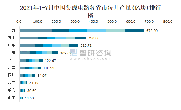 2021年1-7月中國集成電路各省市每月產(chǎn)量排行榜