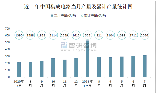 根據(jù)國家統(tǒng)計局數(shù)據(jù)顯示:2021年7月中國集成電路產(chǎn)量為316億塊,同比增長41.3%;2021年1-7月中國集成電路累計產(chǎn)量為2036.2億塊,累計增長47.3%;2015-2020年中國集成電路產(chǎn)量逐年遞增,2020年達到最高。