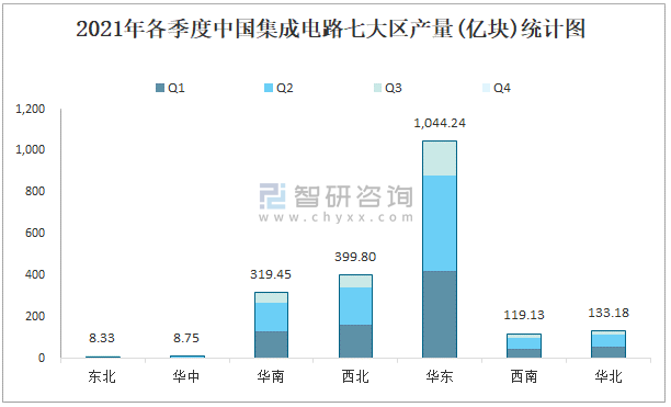 2021年各季度中國集成電路七大區(qū)產(chǎn)量統(tǒng)計圖