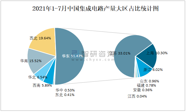 2021年1-7月中國集成電路產(chǎn)量大區(qū)占比統(tǒng)計圖