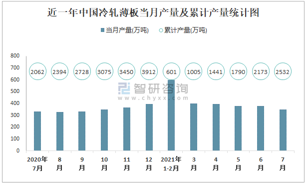 2021年1-7月中國冷軋薄板產量為2531.9萬噸 累計增長18.4%