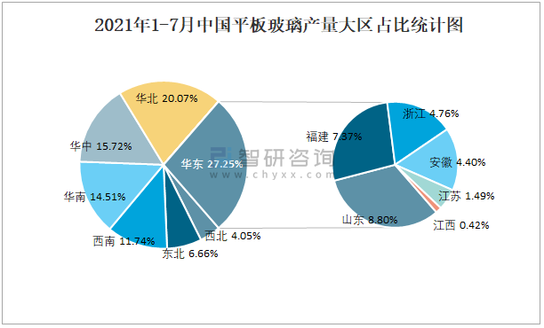 2021年1-7月中國平板玻璃產量大區占比統計圖