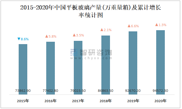 2015-2020年中國平板玻璃產量及增長率統計圖