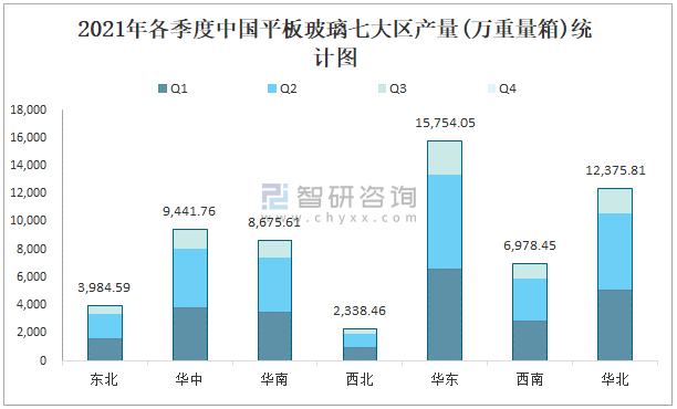 根據國家統計局數據顯示:2021年各季度(第三季度暫只統計7月數據)中國平板玻璃主要集中在華東、華北、華中地區生產;2021年1-7月中國平板玻璃產量大區分布不均衡,其中華東地區產量最高,特別是山東省貢獻了最多產量;2021年1-7月中國平板玻璃各省市產量呈現梯隊式分布,河北、廣東、湖北等省產量最多。