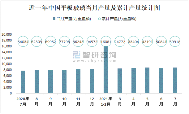 根據國家統計局數據顯示:2021年7月中國平板玻璃產量為8831萬重量箱,同比增長12.3%;2021年1-7月中國平板玻璃累計產量為59917.6萬重量箱,累計增長11.1%;2015-2020年中國平板玻璃產量逐年遞增,2020年達到最高。