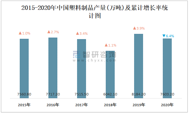 2015-2020年中國塑料制品產量及增長率統計圖