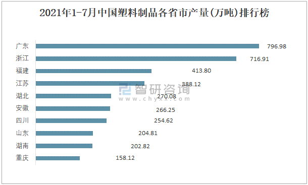 根據國家統計局數據顯示:2021年各季度(第三季度暫只統計7月數據)中國塑料制品主要集中在華東、華南、華中地區生產;2021年1-7月中國塑料制品產量大區分布不均衡,其中華東地區產量最高,特別是浙江省貢獻了最多產量;2021年1-7月中國塑料制品各省市產量呈現梯隊式分布,廣東、浙江、福建等省產量排名前三。
