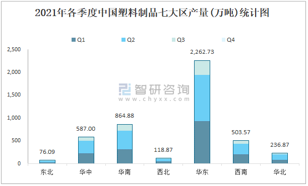 2021年各季度中國塑料制品七大區產量統計圖