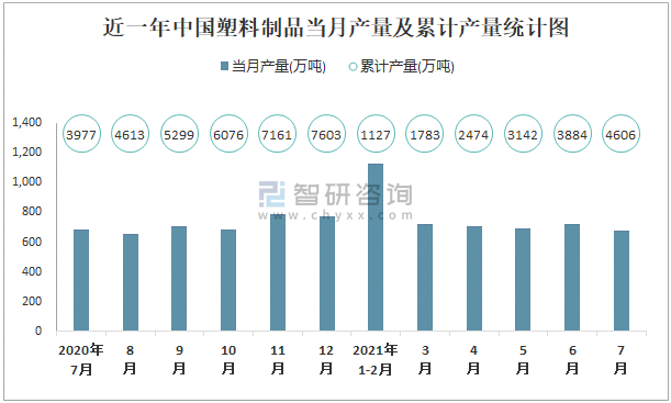 根據國家統計局數據顯示:2021年7月中國塑料制品產量為678萬噸,同比下降1%;2021年1-7月中國塑料制品累計產量為4605.6萬噸,累計增長14.5%;2015-2020年中國塑料制品產量2019年達到最高,此后有所下滑。