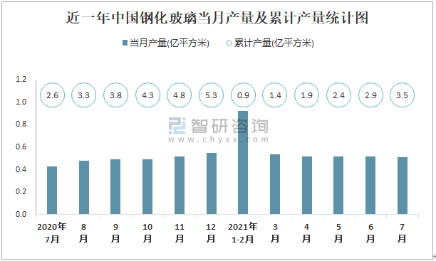 近一年中國鋼化玻璃當月產(chǎn)量及累計產(chǎn)量統(tǒng)計圖