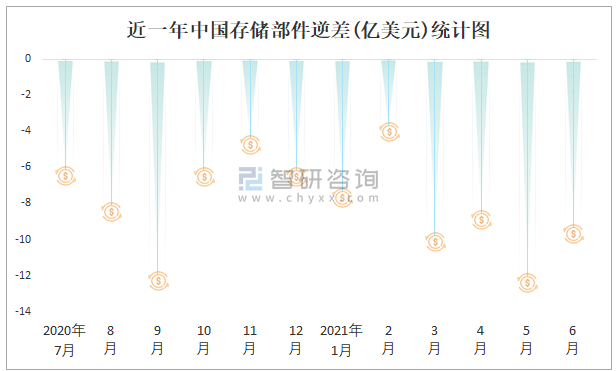近一年中國存儲部件逆差(億美元)統計圖