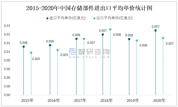 2015-2020年中國存儲部件進出口平均單價統計圖