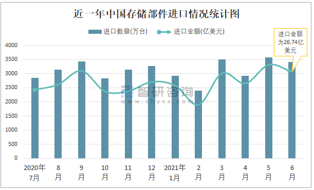 根據中國海關數據顯示:2021年6月中國存儲部件進口數量為3414萬臺,同比增長18.8%,進口金額為26.74億美元,同比增長15.9%,2021年6月中國存儲部件出口數量為2329萬臺,同比增長18.6%,出口金額為17.02億美元,同比增長12.2%;2021年1-6月中國存儲部件進口數量為18748萬臺,進口金額為144.26億美元,出口數量為13774萬臺,出口金額為91.35億美元。