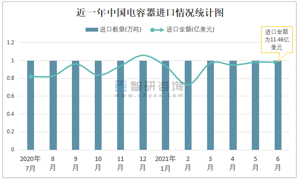 根據(jù)中國海關(guān)數(shù)據(jù)顯示:2021年6月中國電容器進(jìn)口數(shù)量為1萬噸,同比增長25.3%,進(jìn)口金額為11.46億美元,同比增長31.7%,2021年1-6月中國電容器進(jìn)口數(shù)量為4萬噸,進(jìn)口金額為64.82億美元。