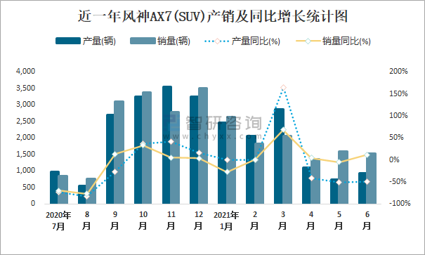 近一年風(fēng)神AX7(SUV)產(chǎn)銷及同比增長(zhǎng)統(tǒng)計(jì)圖