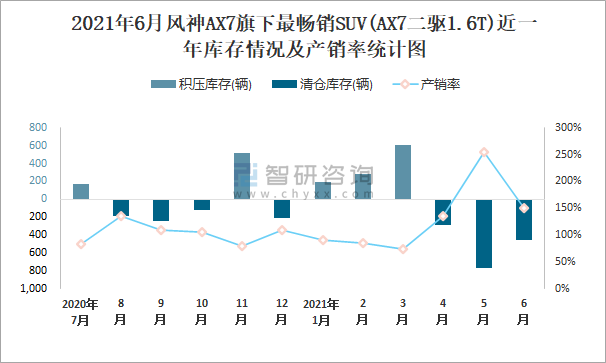 2021年6月風(fēng)神AX7旗下最暢銷SUV(AX7二驅(qū)1.6T)近一年庫存情況及產(chǎn)銷率統(tǒng)計(jì)圖