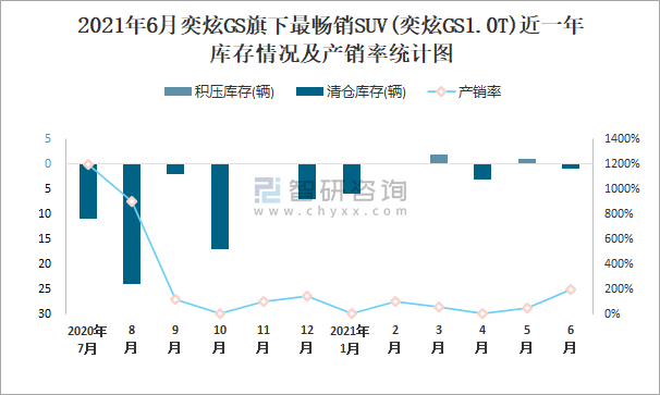 2021年6月奕炫GS旗下最暢銷SUV(奕炫GS1.0T)近一年庫(kù)存情況及產(chǎn)銷率統(tǒng)計(jì)圖