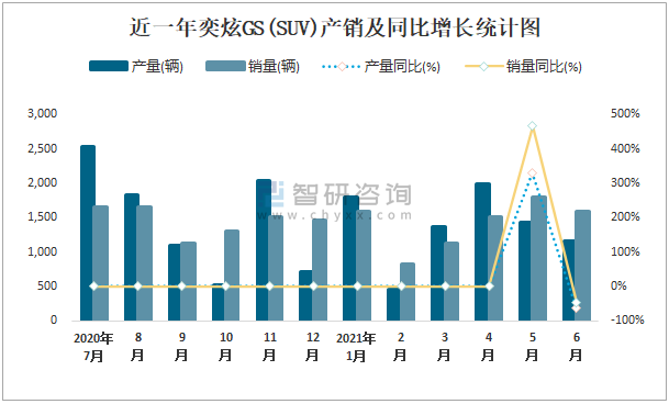根據(jù)中國(guó)汽車工業(yè)協(xié)會(huì)數(shù)據(jù)可知:2021年6月奕炫GS(SUV)產(chǎn)量為1164輛,同比下降64.3%,銷量為1585輛,同比下降47.4%,當(dāng)月產(chǎn)銷率為136.17%;2021年上半年奕炫GS(SUV)產(chǎn)量為8204輛,同比增長(zhǎng)122.2%,銷量為8437輛,同比增長(zhǎng)145.6%,產(chǎn)銷率為102.84%;且2020年奕炫GS(SUV)總產(chǎn)量大于總銷量,積壓了庫(kù)存266輛。