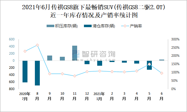 2021年6月傳祺GS8旗下最暢銷SUV(傳祺GS8二驅(qū)2.0T)近一年庫存情況及產(chǎn)銷率統(tǒng)計(jì)圖