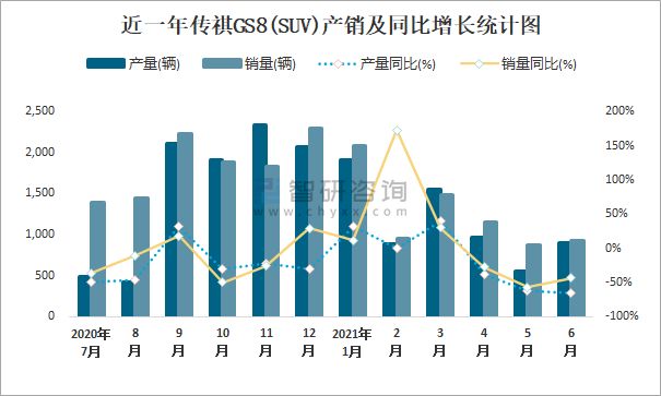 根據(jù)中國汽車工業(yè)協(xié)會(huì)數(shù)據(jù)可知:2021年6月傳祺GS8(SUV)產(chǎn)量為893輛,同比下降65.7%,銷量為931輛,同比下降43.4%,當(dāng)月產(chǎn)銷率為104.26%;2021年上半年傳祺GS8(SUV)產(chǎn)量為6754輛,同比下降18.5%,銷量為7473輛,同比下降13.2%,產(chǎn)銷率為110.65%;2016-2020年傳祺GS8(SUV)產(chǎn)銷量均在2017年達(dá)到最高值,此后逐年遞減,且近5年總產(chǎn)量大于總銷量,積壓了庫存1330輛。