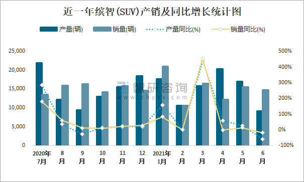 根據(jù)中國汽車工業(yè)協(xié)會數(shù)據(jù)可知:2021年6月繽智(SUV)產(chǎn)量為9134輛,同比下降59.7%,銷量為14710輛,同比下降19.5%,當(dāng)月產(chǎn)銷率為161.05%;2021年上半年繽智(SUV)產(chǎn)量為90480輛,同比增長51.2%,銷量為90418輛,同比增長50.4%,產(chǎn)銷率為99.93%;2016-2020年繽智(SUV)產(chǎn)銷量均在2019年跌至最低值,此后大幅度回升,且近5年總產(chǎn)量大于總銷量,積壓了庫存4495輛。