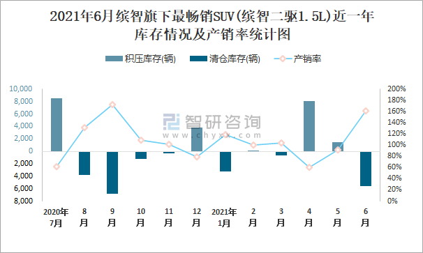 2021年6月繽智旗下最暢銷SUV(繽智二驅(qū)1.5L)近一年庫存情況及產(chǎn)銷率統(tǒng)計圖