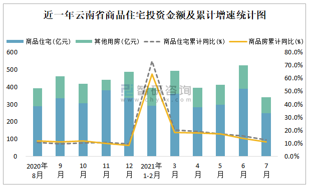 根據(jù)國家統(tǒng)計局數(shù)據(jù)統(tǒng)計可知:2021年7月云南省房地產(chǎn)開發(fā)投資商品房投資金額為341.18億元(其中商品住宅為249.42億元,辦公樓、商業(yè)營業(yè)用房等其他用房91.76億元);2021年1-7月云南省房地產(chǎn)開發(fā)投資商品住宅累計投資金額為1875.15億元,投資金額累計同比增長12.6%。