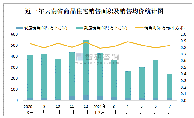 根據(jù)國家統(tǒng)計局數(shù)據(jù)可知:2021年7月云南省商品住宅銷售面積為242.46萬平方米(其中銷售現(xiàn)房24.22萬平方米,期房218.24萬平方米),銷售額為202.29億元,銷售均價約為0.83萬元/平方米;2021年1-7月云南省商品住宅累計銷售面積為1973.62萬平方米,累計銷售額為1621.32億元,銷售額累計同比增長1.3%;近一年云南省商品住宅銷售均價2021年1-2月跌至最低值,此后總體呈現(xiàn)上升趨勢,期房銷售面積遠高于現(xiàn)房銷售面積。