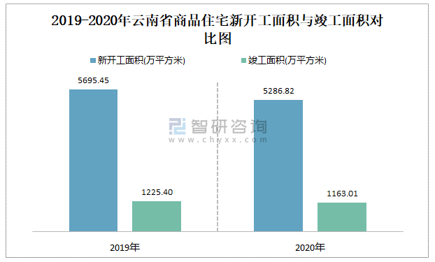 2019-2020年云南省商品住宅新開工面積與竣工面積對比圖