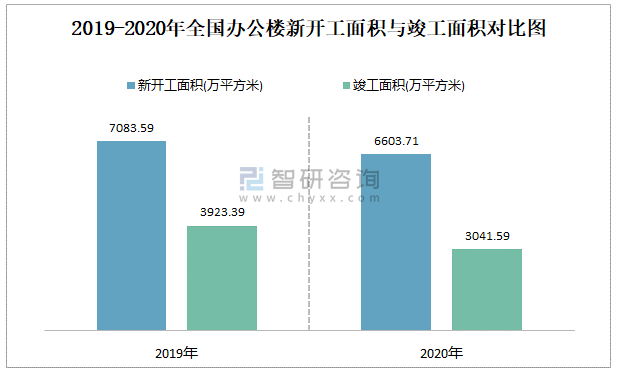 2019-2020年全國辦公樓新開工面積與竣工面積對比圖