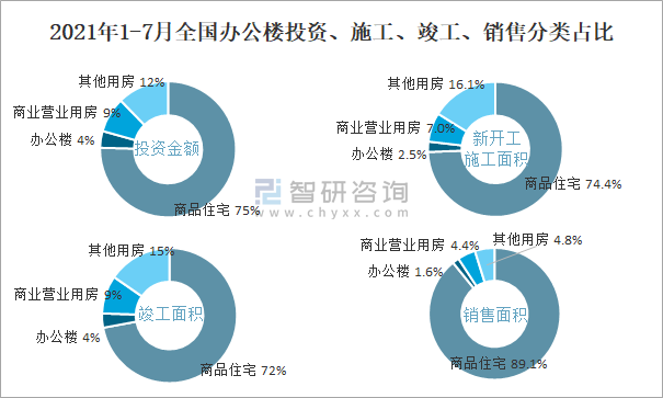 2021年1-7月全國辦公樓投資、施工、竣工、銷售分類占比