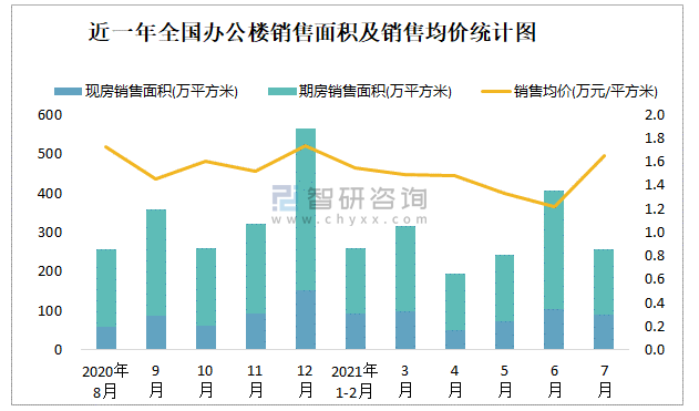 近一年全國辦公樓銷售面積及銷售均價統(tǒng)計圖