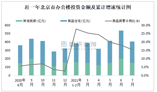 根據國家統計局數據統計可知:2021年7月北京市房地產開發投資商品房投資金額為404.25億元,其中包括辦公樓、商業營業用房等其他用房153.13億元(注:辦公樓、商業營業用房未分開統計);2021年1-7月北京市房地產開發投資包括辦公樓在內的其他用房累計金額為946.08億元。