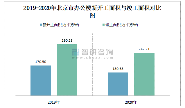 2019-2020年北京市辦公樓新開工面積與竣工面積對比圖
