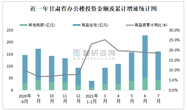 根據(jù)國家統(tǒng)計(jì)局?jǐn)?shù)據(jù)統(tǒng)計(jì)可知:2021年7月甘肅省房地產(chǎn)開發(fā)投資商品房投資金額為162.06億元,其中包括辦公樓、商業(yè)營業(yè)用房等其他用房40.88億元(注:辦公樓、商業(yè)營業(yè)用房未分開統(tǒng)計(jì));2021年1-7月甘肅省房地產(chǎn)開發(fā)投資包括辦公樓在內(nèi)的其他用房累計(jì)金額為199.8億元。