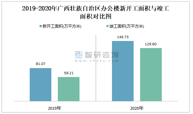 2019-2020年廣西壯族自治區辦公樓新開工面積與竣工面積對比圖