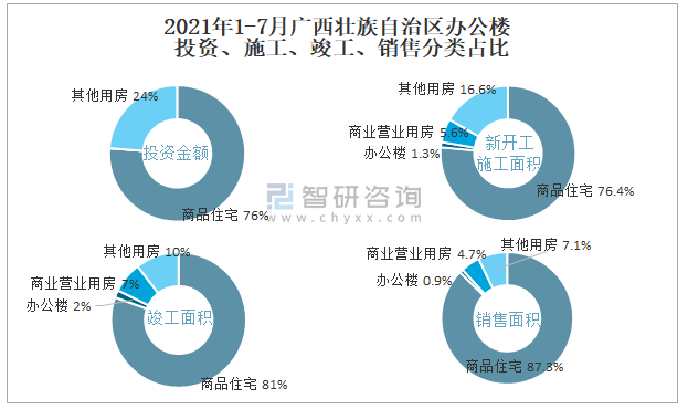 根據國家統計局數據統計可知:2021年1-7月廣西壯族自治區房地產開發企業在包括辦公樓在內的其他用房投資金額占比為23.8%(注:只有投資金額中其他用房包含辦公樓、商業營業用房),辦公樓的新開工面積與竣工面積所占比重差異不大,從銷售面積來看,辦公樓銷售面積占比少于商業營業用房銷售面積占比。