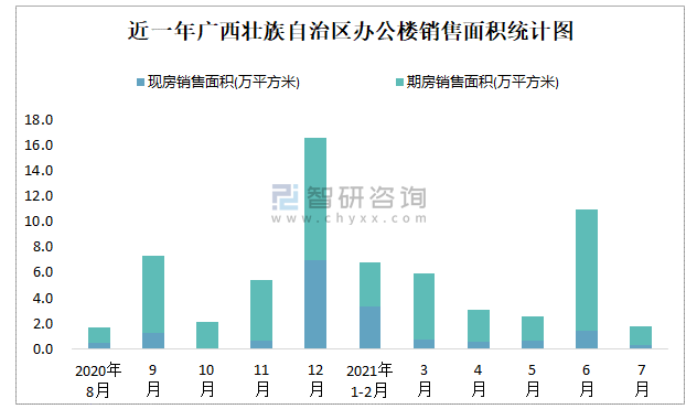 根據國家統計局數據可知:2021年7月廣西壯族自治區辦公樓銷售面積為1.78萬平方米(其中銷售現房0.31萬平方米,期房1.47萬平方米);2021年1-7月廣西壯族自治區辦公樓累計銷售面積為31萬平方米;近一年廣西壯族自治區辦公樓期房銷售面積遠高于現房銷售面積,2021年7月四川、廣東、江蘇的辦公樓銷售面積最多,江蘇、上海、浙江、廣東的辦公樓現房銷售面積高于其他各省市。