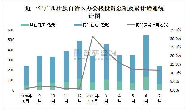 根據國家統計局數據統計可知:2021年7月廣西壯族自治區房地產開發投資商品房投資金額為241.16億元,其中包括辦公樓、商業營業用房等其他用房61.26億元(注:辦公樓、商業營業用房未分開統計);2021年1-7月廣西壯族自治區房地產開發投資包括辦公樓在內的其他用房累計金額為543.56億元。