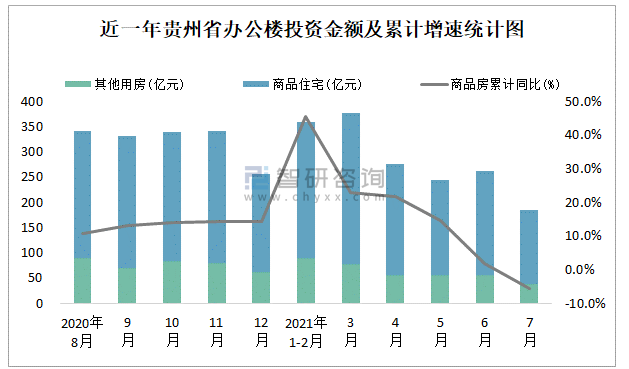 根據國家統計局數據統計可知:2021年7月貴州省房地產開發投資商品房投資金額為184.71億元,其中包括辦公樓、商業營業用房等其他用房38.94億元(注:辦公樓、商業營業用房未分開統計);2021年1-7月貴州省房地產開發投資包括辦公樓在內的其他用房累計金額為378.08億元。