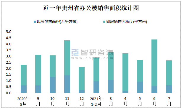 根據國家統計局數據可知:2021年7月貴州省辦公樓銷售面積為2.66萬平方米(其中銷售現房0.64萬平方米,期房2.02萬平方米);2021年1-7月貴州省辦公樓累計銷售面積為19.19萬平方米;近一年貴州省辦公樓期房銷售面積遠高于現房銷售面積,2021年7月四川、廣東、江蘇的辦公樓銷售面積最多,江蘇、上海、浙江、廣東的辦公樓現房銷售面積高于其他各省市。