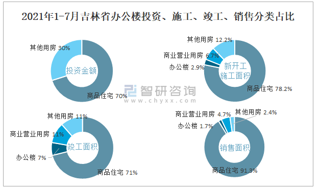 根據國家統計局數據統計可知:2021年1-7月吉林省房地產開發企業在包括辦公樓在內的其他用房投資金額占比為29.9%(注:只有投資金額中其他用房包含辦公樓、商業營業用房),辦公樓的新開工面積與竣工面積所占比重差異不大,從銷售面積來看,辦公樓銷售面積占比少于商業營業用房銷售面積占比。