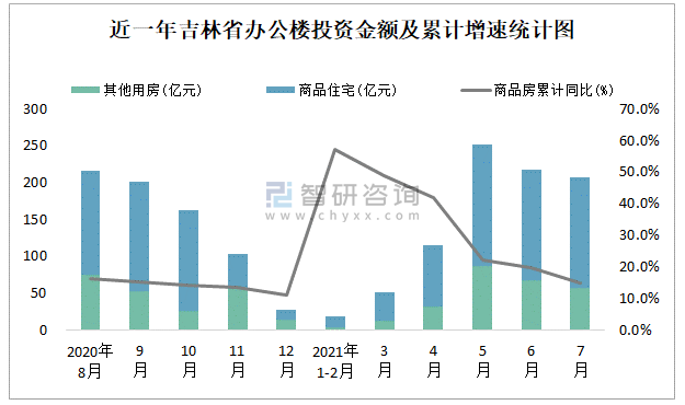 根據國家統計局數據統計可知:2021年7月吉林省房地產開發投資商品房投資金額為207.84億元,其中包括辦公樓、商業營業用房等其他用房57.04億元(注:辦公樓、商業營業用房未分開統計);2021年1-7月吉林省房地產開發投資包括辦公樓在內的其他用房累計金額為257.63億元。