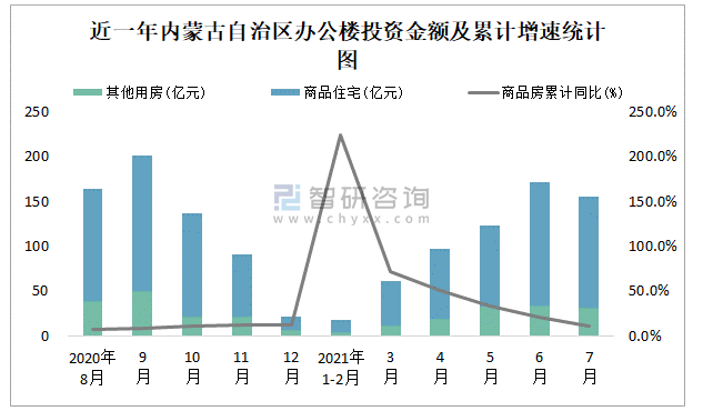 根據(jù)國家統(tǒng)計局數(shù)據(jù)統(tǒng)計可知:2021年7月內(nèi)蒙古自治區(qū)房地產(chǎn)開發(fā)投資商品房投資金額為155.53億元,其中包括辦公樓、商業(yè)營業(yè)用房等其他用房32.09億元(注:辦公樓、商業(yè)營業(yè)用房未分開統(tǒng)計);2021年1-7月內(nèi)蒙古自治區(qū)房地產(chǎn)開發(fā)投資包括辦公樓在內(nèi)的其他用房累計金額為134.05億元。