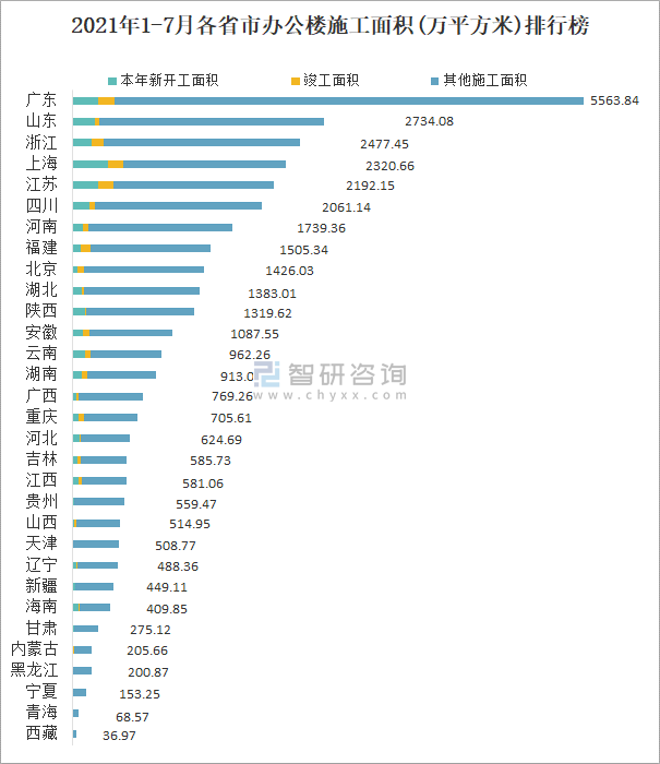 2021年1-7月各省市辦公樓施工面積(萬平方米)排行榜