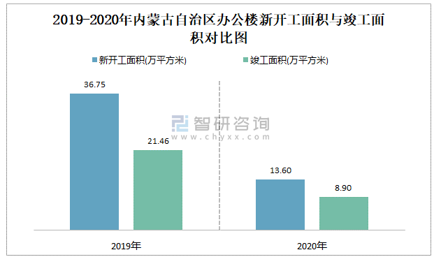 2019-2020年內(nèi)蒙古自治區(qū)辦公樓新開工面積與竣工面積對比圖