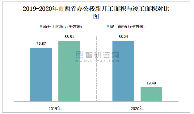 2019-2020年山西省辦公樓新開工面積與竣工面積對比圖