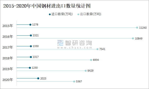 2015-2020年中國鋼材進出口數(shù)量統(tǒng)計圖