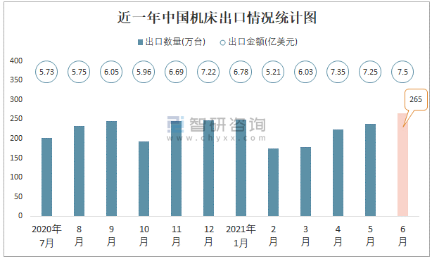 根據中國海關數據顯示:2021年6月中國機床進口數量為1.17萬臺,同比增長31%,進口金額為7.55億美元,同比增長10.6%,2021年6月中國機床出口數量為265.21萬臺,同比增長33.4%,出口金額為7.5億美元,同比增長41.8%;2021年1-6月中國機床進口數量為5.73萬臺,進口金額為40.76億美元,出口數量為1329.91萬臺,出口金額為40.13億美元。